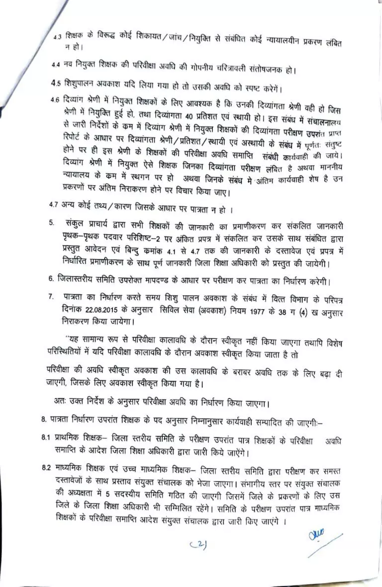 अगर शिक्षक परिवीक्षा अवधि के दौरान शिशुपालन अवकाश लिया हो तो उसकी उसे पुष्टी कनी होगी। जिलास्तरीय समिति उपरोक्त सभी मापदंड के आधार पर परीक्षण कर शिक्षकों की पात्रता का निर्धारण करेगी।