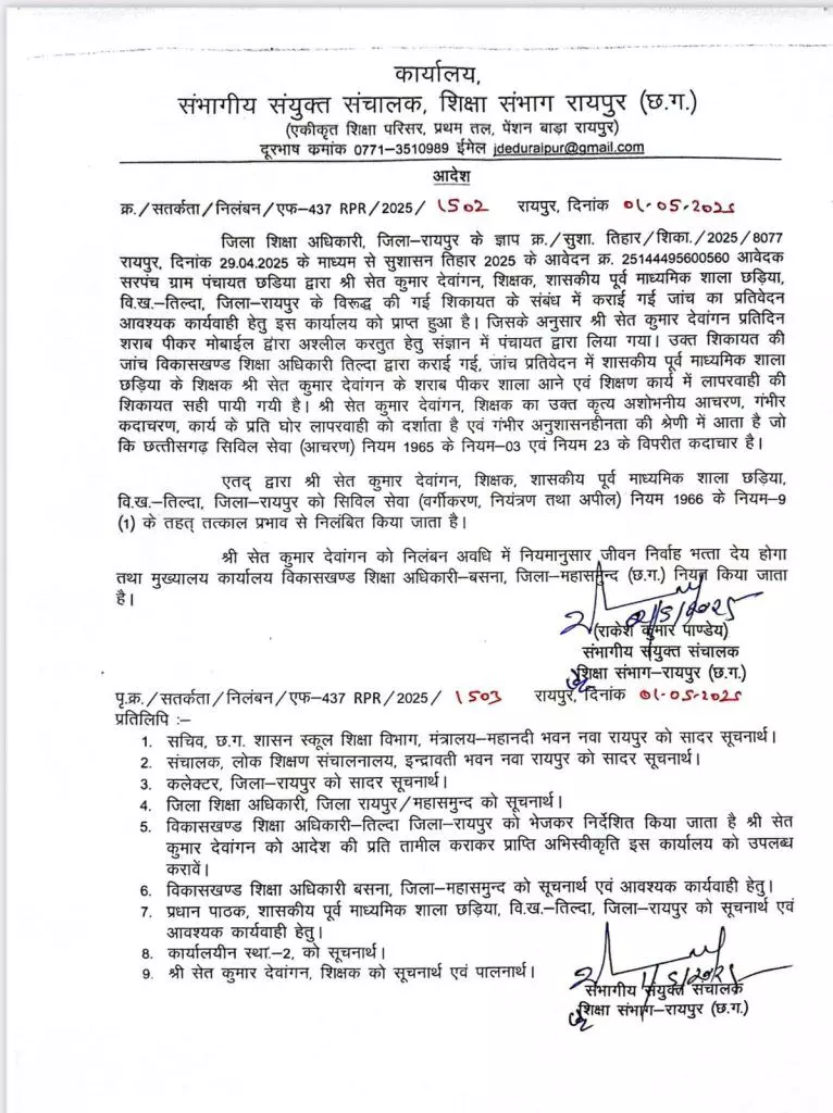 शिक्षा संभागीय संयुक्त संचालक राकेश पांडेय ने बताया कि सुशासन तिहार में शिक्षक सेत कुमार देवांगन के खिलाफ छड़िया सरपंच ने शिकायत की थी। जिसमें बताया गया था कि शासकीय पूर्व माध्यमिक शाला छड़िया, विकासखंड तिल्दा में पदस्थ शिक्षक सेत देवांगन रोज शराब पीकर स्कूल पहुंचता है।