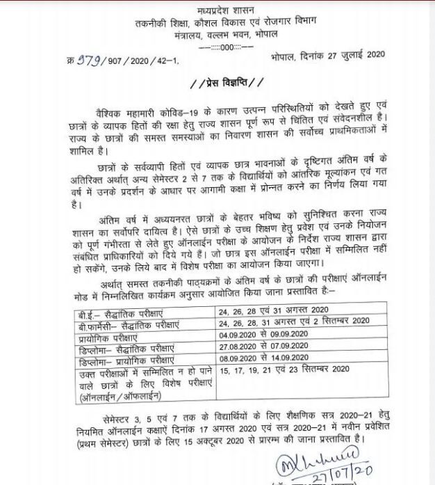 परीक्षाओं की डेटशीट जारी होने के बाद मुख्यमंत्री शिवराज सिंह ने ट्वीट कर छात्रों को संदेश दिया। उन्होंने लिखा की प्रदेश के मेरे विद्यार्थी साथियों, #COVID19 संक्रमण को लेकर सरकार सजग है। सभी की सुरक्षा को ध्यान में रखा गया है, सावधानी का पालन किया जा रहा है।हमने आपके हित में प्रदेश के तकनीकी कॉलेजों की परीक्षाओं को लेकर कुछ महत्वपूर्ण निर्णय लिए हैं, जिन्हें मैं आपके साथ साझा कर रहा हूँ।डिप्लोमा पाठ्यक्रमों के अंतिम वर्ष/सेम. के विद्यार्थियों की सैद्धांतिक व प्रयोगिक परीक्षाएँ 27 अगस्त 2020 से 14 सितंबर 2020 के बीच ऑनलाइन मोड में होंगी। जो विद्यार्थी सम्मिलित नहीं हो सकेंगे, उनके लिए विशेष ऑनलाइन/ऑफलाइन परीक्षा 15 से 23 सितंबर 2020 के बीच आयोजित की जाएंगी।दूसरे सेमेस्टर से लेकर सातवें सेमेस्टर तक के विद्यार्थियों के लिए शैक्षणिक सत्र 2020-21 की नियमित ऑनलाइन कक्षाएँ 17 अगस्त 2020 से प्रारम्भ की जाएंगी।नया प्रवेश लेने वाले विद्यार्थियों के लिए नियमित ऑनलाइन कक्षाएँ 15 अक्टूबर 2020 से प्रारम्भ की जाएंगी।