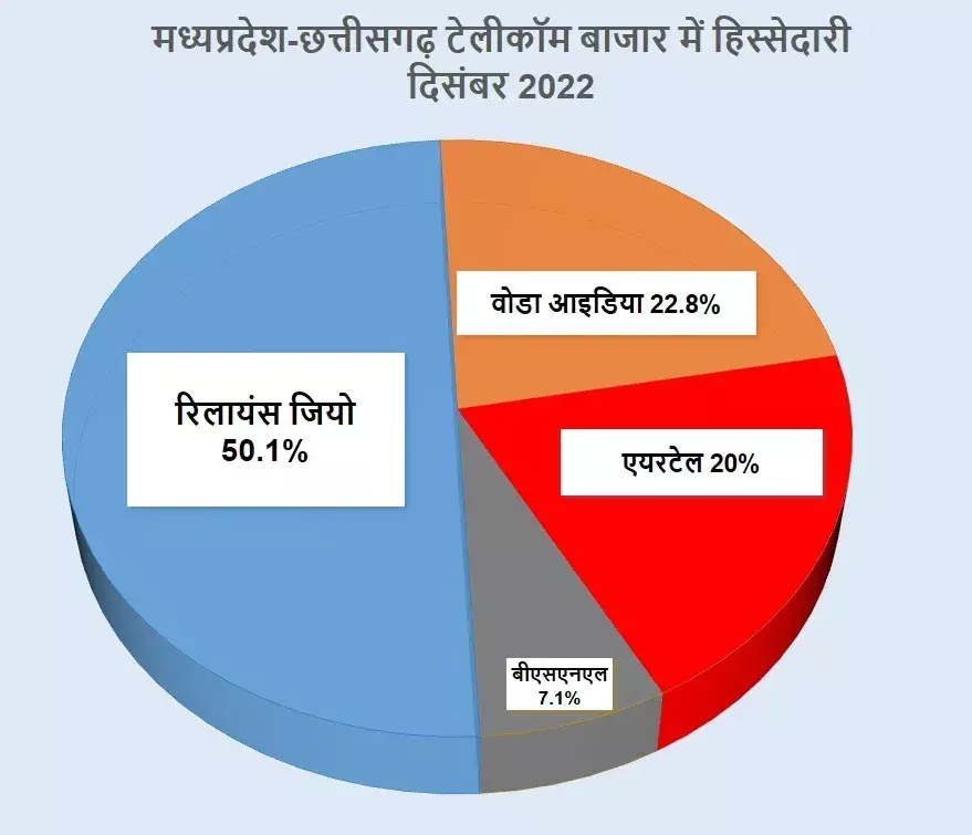 वहीँ मप्र-छग में वोडाफोन आइडिया की 22.8 फीसदी और एयरटेल की 20 फीसदी हिस्सेदारी रही। बीएसएनएल की बाजार हिस्सेदारी 7.1 फीसदी है। दिसंबर 2022 में एयरटेल के मोबाइल ग्राहक 3.8 हजार घटकर 1.52 करोड़ हो गए। वोडाफोन आइडिया ने इस दौरान 2.63 लाख ग्राहक खो दिए अब कंपनी के सर्किल में 1.73 करोड़ ग्राहक हैं। बीएसएनएल के ग्राहक 61.8 हजार घटकर 54.4 लाख हो गए।
