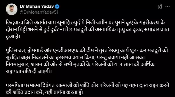 सीएम मोहन यादव ने बुधवार को सोशल मीडिया अकाउंट पर पोस्ट साझा करते हुए लिखा कि, छिंदवाड़ा जिले अंतर्गत ग्राम खूनाझिरखुर्द में निजी जमीन पर पुराने कुएं के गहरीकरण के दौरान मिट्टी धंसने से हुई दुर्घटना में 3 मजदूरों की असामयिक मृत्यु का दुखद समाचार प्राप्त हुआ है।