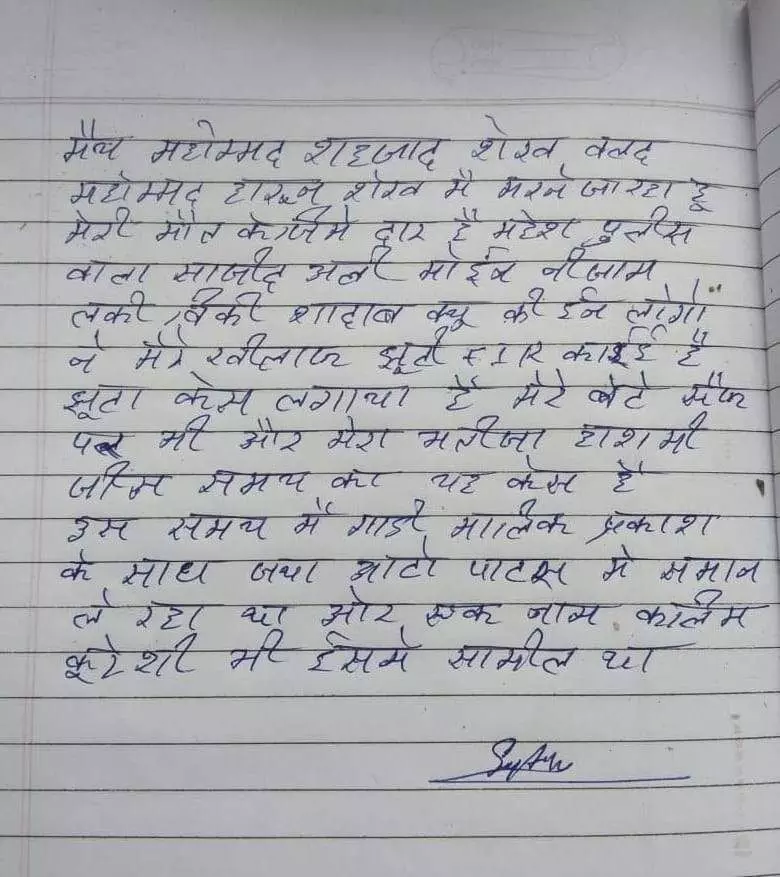 मृतक युवक ने सुसाइड नोट में लिखा कि, मैं महोम्मद शहजाद शेख वलद महोम्मद हारून शेख मैं मरने जा रहा है मेरी मौत के जिम्मेदार है महेश पुलिस वाला साजीत अली मोईब नीजाम लकी, विक्की शादाब। क्योंकि इन लोगों ने मेरे खिलाफ झूठी FIR करवाई है। झूठा केस लगाया है मेरे बेटे सैफ और मेरा भतीजा राशमी पर। जिस समय का यह केस है उस समय मैं गाड़ी, मालिक प्रकाश के साथ जया ऑटो पार्ट्स में समान ले रहा था और एक नाम कालम कुरेशी भी इसमें शामिल था।