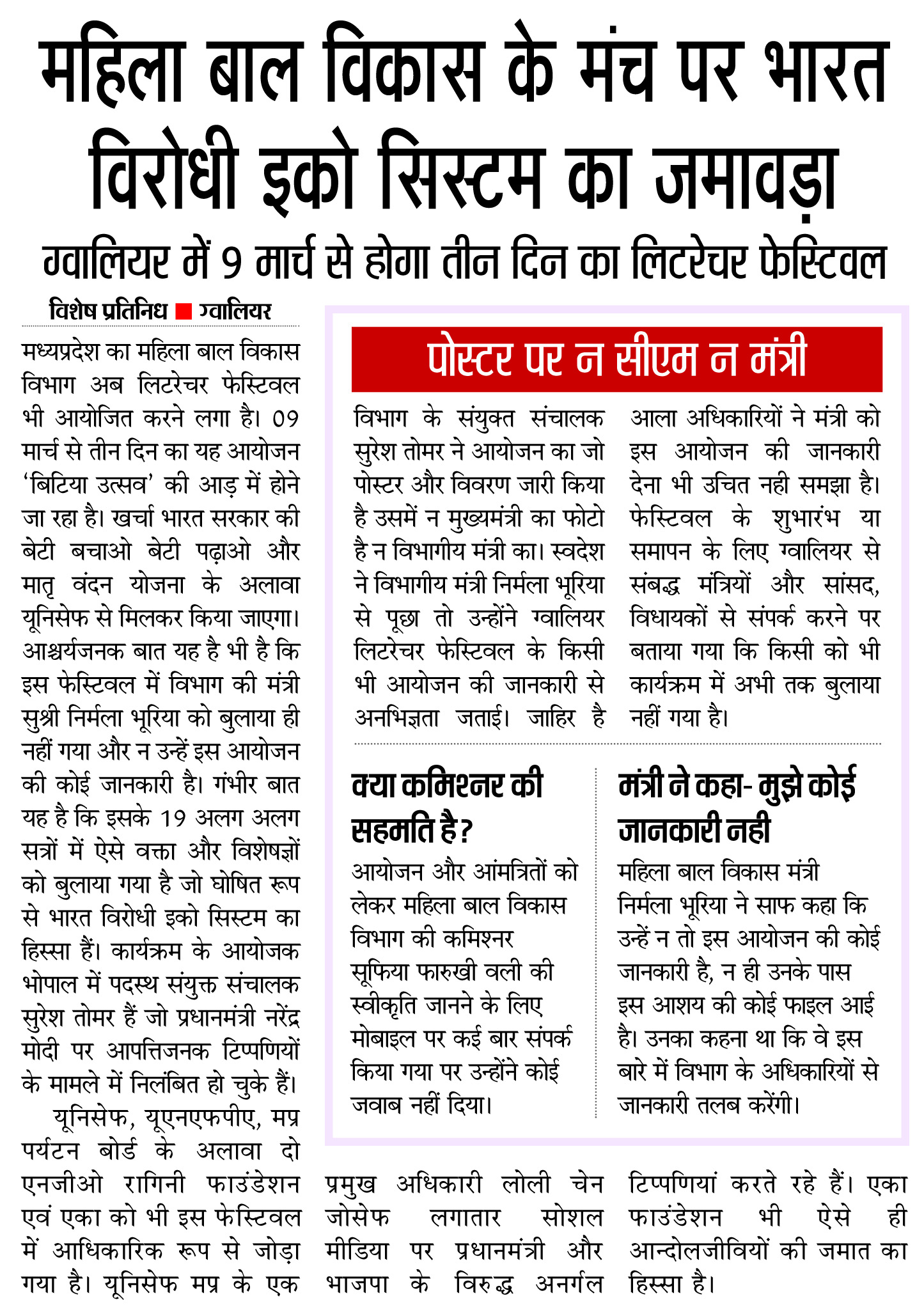 |विशेष प्रतिनिधि, भोपाल। मप्र महिला बाल विकास विभाग ने 9 मार्च से आयोजित तीन दिवसीय ग्वालियर लिटरेचर फेस्टिवल एवं बिटिया महोत्सव स्थगित कर दिया है। विभाग की ओर से गुरुवार को जारी प्रेस नोट में यह जानकारी दी गई। उल्लेखनीय है कि स्वदेश ने गुरुवार के अंक में इस आयोजन के स्वरूप एवं प्रकृति से जुड़े विवादस्पद पहलुओं को केंद्रित कर समाचार प्रकाशित किया था। ग्वालियर के बुद्धिजीवी, कला प्रेमी एवं अन्य सामाजिक कार्यकर्ताओं ने इस आयोजन की विषय वस्तु को लेकर आपत्तियां दर्ज कराई थीं।