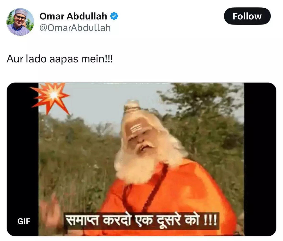 चुनाव से पहले आम आदमी पार्टी और कांग्रेस ने INDIA गठबंधन के तहत एकसाथ चुनाव लड़ने से इंकार कर दिया था। दोनों पार्टियों ने एक दूसरे के खिलाफ खूब प्रचार किया। लोकसभा चुनाव में जो एक दूसरे के त्याग बलिदान और ईमानदारी की दुहाई दे रहे थे उन्होंने विधानसभा चुनाव में एक दूसरे पर बेईमानी और भ्रष्टाचार के आरोप लगाए। जब विधानसभा चुनाव के परिणाम आने शुरू हुए तो नेशनल कॉन्फ्रेंस के नेता और मुख्यमंत्री उमर अब्दुल्लाह ने एक्स पर मीम शेयर किया और तंज कसते हुए कहा - "और लड़ो आपस में"