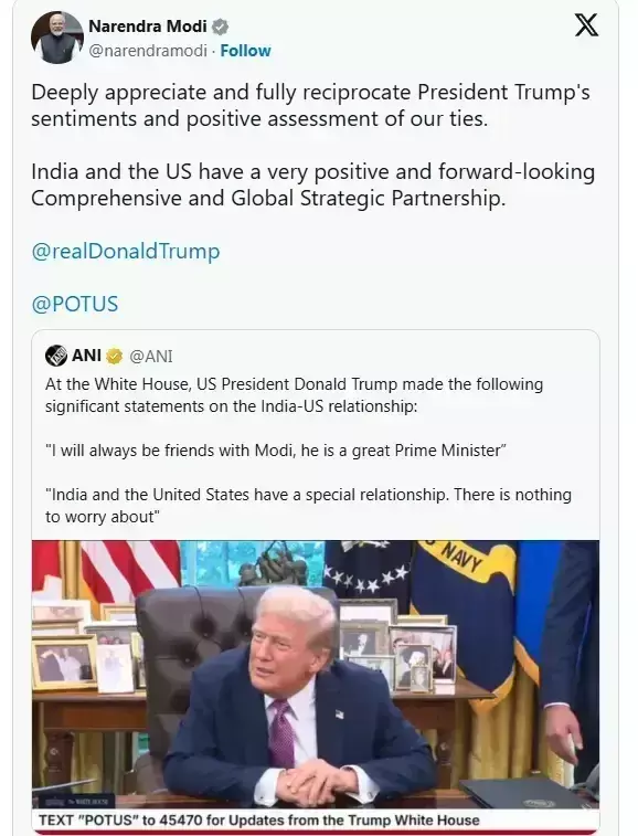 नई दिल्ली। प्रधानमंत्री नरेन्द्र मोदी ने अमेरिकी राष्ट्रपति डोनाल्ड जे. ट्रंप के सकारात्मक रुख को सराहा है। उन्होंने एक्स पोस्ट पर आज कहा कि राष्ट्रपति ट्रंप की भावना और दोनों देशों के संबंधों का सकारात्मक मूल्यांकन प्रशंसनीय है। प्रधानमंत्री मोदी ने एक्स पर लिखा, ''राष्ट्रपति ट्रंप की भावनाओं और संबंधों के सकारात्मक मूल्यांकन की वह दिल से सराहना और उनका पूर्ण समर्थन करते हैं। भारत और अमेरिका के बीच एक अत्यंत सकारात्मक और दूरदर्शी व्यापक एवं वैश्विक रणनीतिक साझेदारी है।''