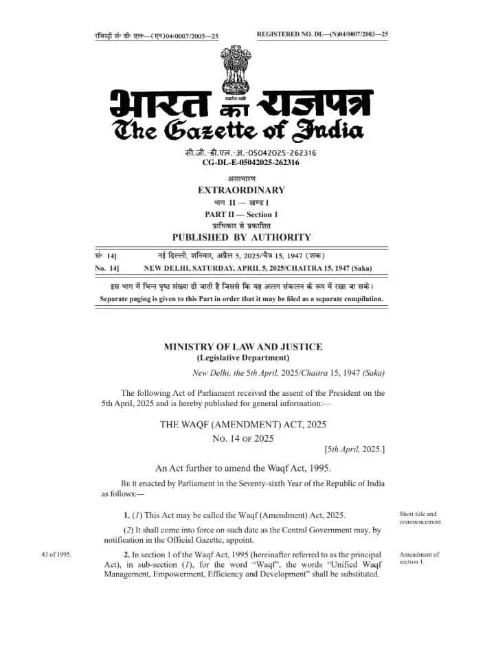 संसद के दोनों सदनों के बाद अब वक्फ संशोधन विधेयक को राष्ट्रपति द्रौपदी मुर्मू से भी मंजूरी मिल गई है। सीधे शब्दों में कहें तो पूरे देश में अब एक नया क़ानून लागू होगा। जिससे देश के ग़रीब और पसमांदा मुसलमानों और मुस्लिम समुदाय की महिलाओं की स्थिति में सुधार लाया जा सकेगा। शनिवार देर रात राष्ट्रपति द्रौपदी मुर्मू ने इस विधेयक पर अपने हस्ताक्षर किए। इसके पहले बुधवार देर रात लोकसभा में और गुरुवार देर रात राज्यसभा में विधेयक पूर्ण बहुमत से पारित हुआ था।