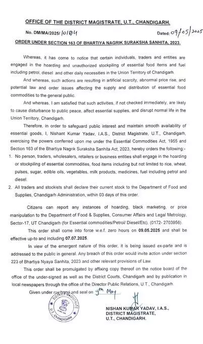 चंडीगढ़ के जिला मजिस्ट्रेट ने आवश्यक वस्तु अधिनियम के तहत आवश्यक वस्तुओं (चावल, गेहूं, चीनी, ईंधन, आदि) की जमाखोरी पर प्रतिबंध लगा दिया है। जिला प्रशासन का कहना है कि व्यापारियों को 3 दिनों के भीतर खाद्य एवं आपूर्ति विभाग को मौजूदा स्टॉक की जानकारी देनी होगी।