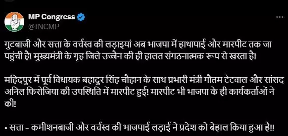 मध्य प्रदेश कांग्रेस ने इस घटना का वीडियो सोशल मीडिया के X अकाउंट पर साझा करते हुए कहा कि, गुटबाजी और सत्ता के वर्चस्व की लड़ाइयां अब भाजपा में हाथापाई और मारपीट तक जा पहुंची है! मुख्यमंत्री के गृह जिले उज्जैन की ही हालत संगठनात्मक रूप से खस्ता है!