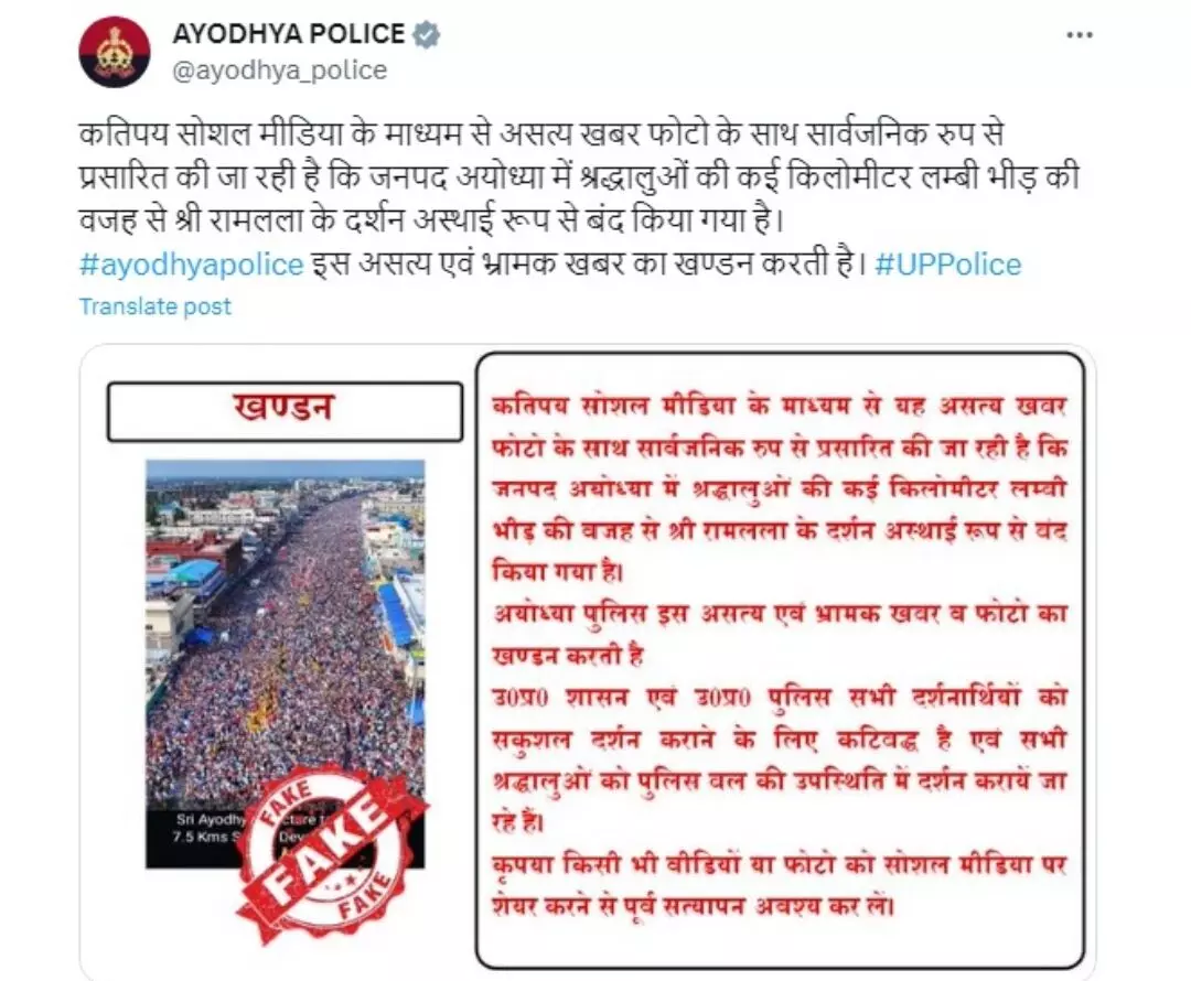 अयोध्या पुलिस ने अपने ऑफिशियल एक्स हैंडल पर इस खबर का खंडन करते हुए लिखा, ''कतिपय सोशल मीडिया के माध्यम से असत्य खबर फोटो के साथ सार्वजनिक रुप से प्रसारित की जा रही है कि जनपद अयोध्या में श्रद्धालुओं की कई किलोमीटर लम्बी भीड़ की वजह से श्री रामलला के दर्शन अस्थाई रूप से बंद किया गया है। अयोध्या पुलिस इस असत्य एवं भ्रामक खबर का खण्डन करती है।''