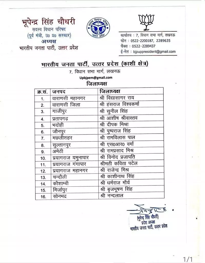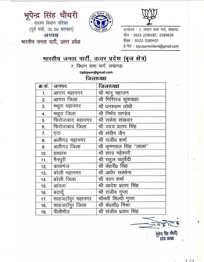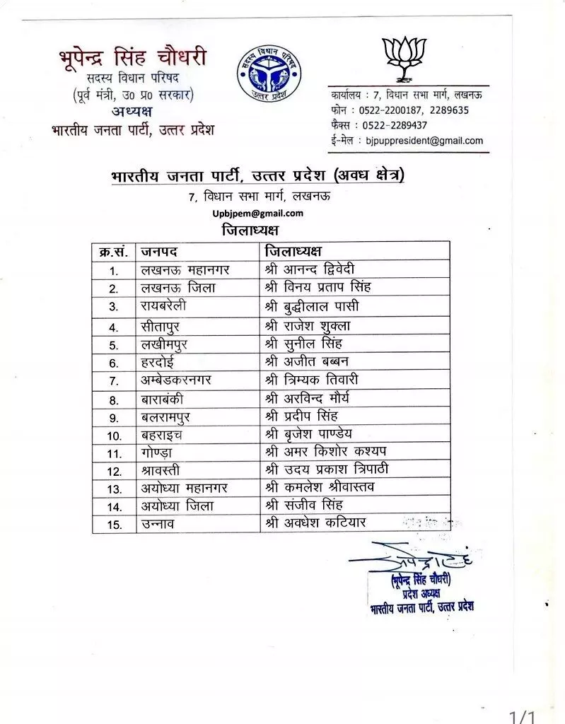 भाजपा ने लखनऊ महानगर अध्यक्ष पद की जिम्मेदारी आनंद द्विवेदी को दी है, जबकि जिलाध्यक्ष पद पर विनय प्रताप सिंह को लाया गया है। सुलतानपुर से डा. आरए वर्मा एक बार फिर भाजपा जिलाध्यक्ष बने हैं। आगरा में भाजपा जिलाध्यक्ष गिर्राज कुशवाहा और महानगर अध्यक्ष भानु महाजन को दोबारा मौका मिला है। दोनों पर पार्टी फिर से भरोसा जताया है।