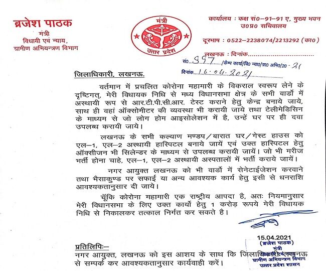 प्रदेश सरकार में विधायी, न्याय व ग्रामीण अभियंत्रण मंत्री ब्रजेश पाठक एक बार फिर जनहित में आगे आये हैं। पाठक ने जिलाधिकारी लखनऊ को पत्र लिखकर अपनी विधायक निधि से तत्काल एक करोड़ रुपया निर्गत करने को कहा है। इस धनराशि ने लखनऊ मध्य विधानसभा के सभी वार्डों में लोगों का कोरोना का आरटीपीसीआर टेस्ट कराने के केंद्र बनाने को कहा है। इसके साथ ही मंत्री ने कहा है कि जिलाधिकारी ऑक्सीमीटर तथा मध्य क्षेत्र के अस्पतालों में ऑक्सीजन आदि की व्यवस्था करें। पाठक ने अपनी विधायक निधि से लखनऊ मध्य क्षेत्र के लोगों की कोरोना की निशुल्क जांच कराने को कहा है।