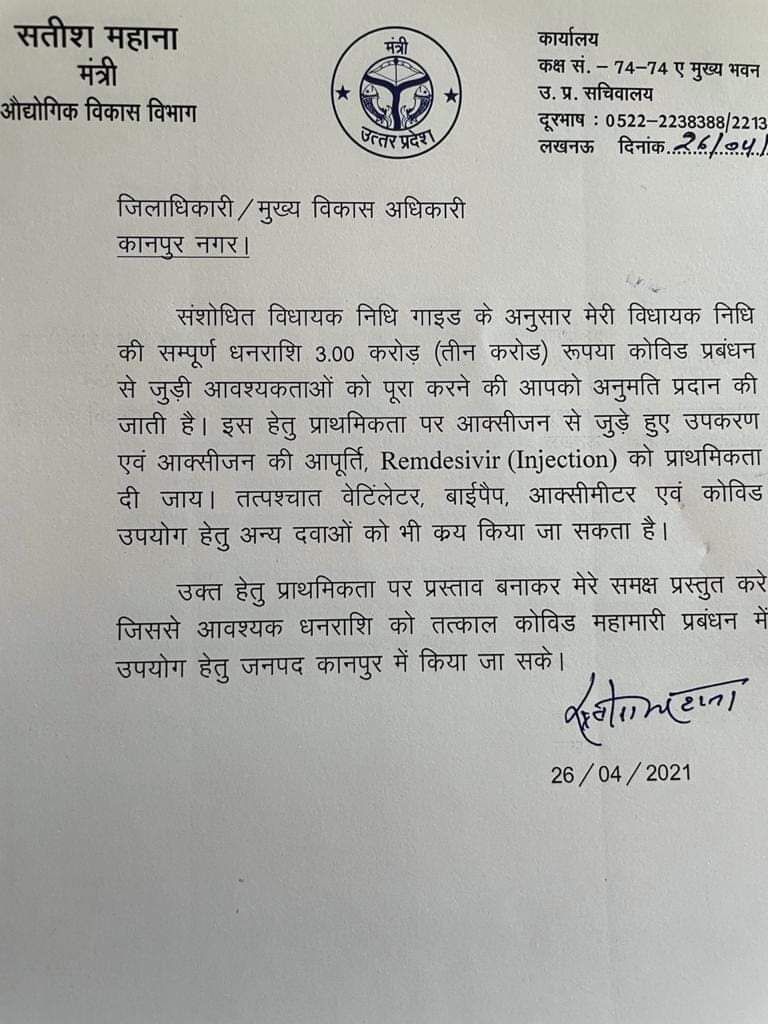 लखनऊ के बाद कानपुर में सबसे अधिक 18 हजार से अधिक कोरोना संक्रमित मरीज हैं। कानपुर में कोरोना संक्रमित मरीजों को चिकित्सीय सुविधाएं बढ़ाने के लिए वहां के स्थानीय विधायक व औद्योगिक विकास मंत्री सतीश महाना शुक्रवार को लखनऊ पहुंचे। वह सबसे पहले ऑक्सीजन की समस्या की निगरानी के लिए अपर मुख्य सचिव गृह के यहां बने कंट्रोल रूम पहुंचे। उन्होंने कहा कि कानपुर के लिए ऑक्सीजन की पर्याप्त सप्लाई मुहैया कराई जाए। जिससे कानपुर के निवासियों को राहत मिल सके।