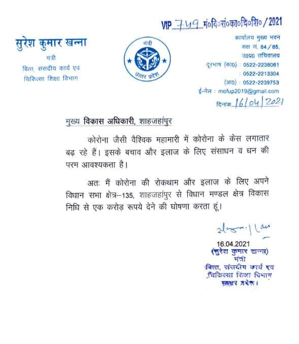 |मंत्री सुरेश कुमार खन्ना ने कोरोना महामारी से बचाव एवं इलाज हेतु आवश्यक संसाधनों की व्यवस्था हेतु शुक्रवार को अपने विधान मंडल क्षेत्र विकास निधि से 1 करोड़ रुपए की धनराशि देने की घोषणा की है।