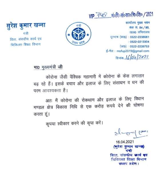 लखनऊ: उत्तर प्रदेश सरकार के वित्त, संसदीय कार्य एवं चिकित्सा शिक्षा मंत्री सुरेश कुमार खन्ना ने कोरोना महामारी से बचाव एवं इलाज हेतु आवश्यक संसाधनों की व्यवस्था हेतु शुक्रवार को अपने विधान मंडल क्षेत्र विकास निधि से 1 करोड़ रुपए की धनराशि देने की घोषणा की है।