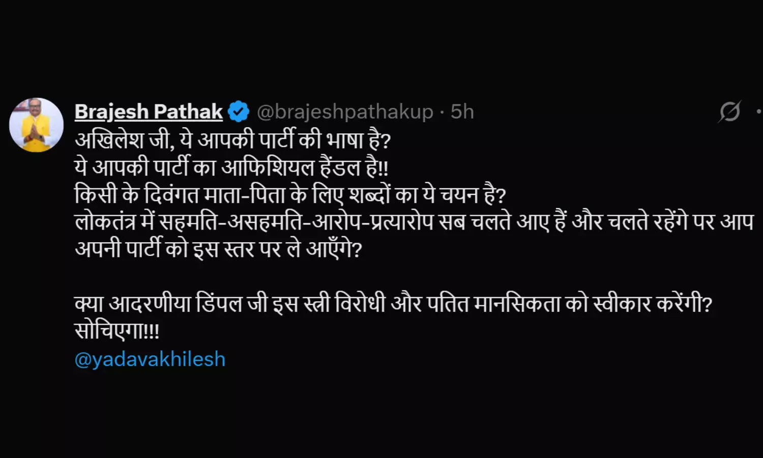 ब्रजेश पाठक ने पोस्ट लिखकर अखिलेश यादव से पूछा सवाल : उप मुख्यमंत्री ब्रजेश पाठक ने एक्स पर पोस्ट करते हुए लिखा कि अखिलेश जी, ये आपकी पार्टी की भाषा है। ये आपकी पार्टी का ऑफिशियल हैंडल है। किसी के दिवंगत माता-पिता के लिए शब्दों का ये चयन है। लोकतंत्र में सहमति-असहमति, आरोप- प्रत्यारोप सब चलते आए हैं और चलते रहेंगे पर आप पार्टी को इस स्तर पर ले आएंगे। उप मुख्यमंत्री ने पोस्ट के जरिये कहा कि क्या डिंपल यादव इस स्त्री विरोधी और पतित मानसिकता को स्वीकार करेंगी।