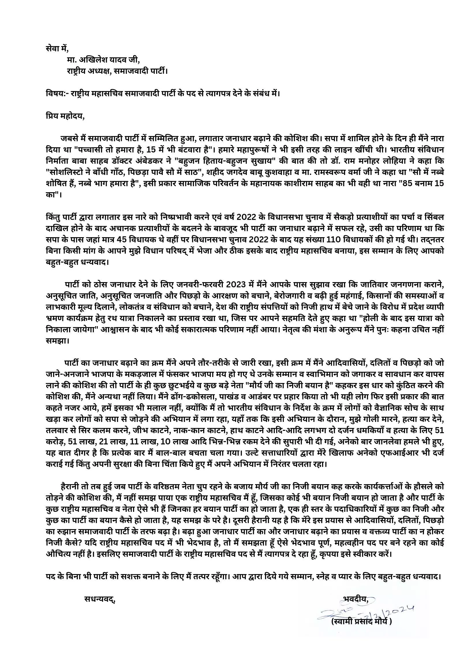 स्वामी प्रसाद मौर्य ने ट्विटर पर शेयर किए इस्तीफे में लिखा-