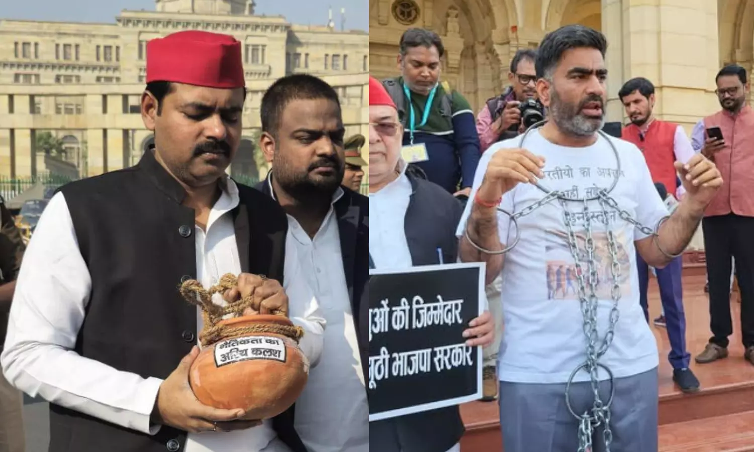 बेड़ियों में जकड़े सपा विधायकों का सदन के बाहर अनोखा विरोध