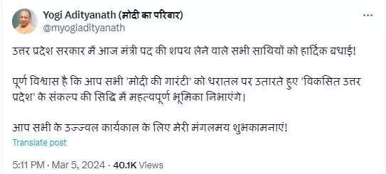 मुख्यमंत्री योगी आदित्यनाथ ने बधाई दी। उन्होंने सोशल मीडिया साइट एक्स पर कहा कि उत्तर प्रदेश सरकार में आज मंत्री पद की शपथ लेने वाले सभी साथियों को हार्दिक बधाई! पूर्ण विश्वास है कि आप सभी 'मोदी की गारंटी' को धरातल पर उतारते हुए 'विकसित उत्तर प्रदेश' के संकल्प की सिद्धि में महत्वपूर्ण भूमिका निभाएंगे। आप सभी के उज्ज्वल कार्यकाल के लिए मेरी मंगलमय शुभकामनाएं!