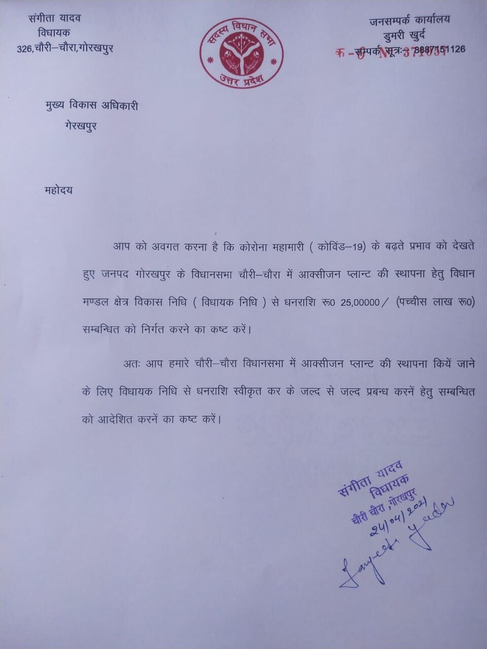 |चौरी चौरा की विधायक संगीता यादव ने अपने विधानसभा क्षेत्र चौरीचौरा में ऑक्सीजन प्लांट स्थापित करने के लिए विधायक निधि से 25 लाख रुपए देने की घोषणा की है।