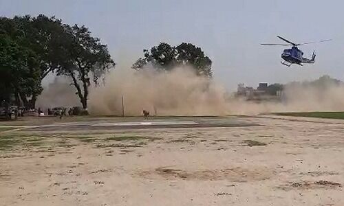 बता दें कि जिले में मुख्यमंत्री योगी आदित्यनाथ का कार्यक्रम पूर्व निर्धारित था। पिछले 24 घंटे से प्रशासन सीएम के आगमन की तैयारी में जुटा था। सीएम का हेलीकाप्टर निर्धारित समय पर अपराह्न 2 बजे पुलिस लाइन पहुंचा। सुरक्षा कर्मियों ने चारो तरफ किलेबंदी कर रखी थी। किसी बाहरी को अंदर आने की अनुमति नहीं थी। बस गिने चुने भाजपा के लोग वहां पहुंचे थे। हड़कंप उस समय मच गया जब सीएम का हेलीकाप्टर पुलिस लाइन परिसर में उतरने लगा और उसी समय एक गाय मैदान में नजर आयी। जब तक लोग कुछ समझ पाते गाय हेलीकाप्टर की तेज आवाज और धूल की गुबार देख घबराकर भागने लगी। हेलीकाप्टर नीचे आता रहा और गाय भागकर हेलीपैड के पास पहुंच गयी। अच्छा यह था कि गाय हड़बड़ाहट में ही दौड़ती हुए मैदान के बाहर निकल गयी। कुछ ही सेकेंड बाद सीएम का हेलीकाप्टर नीचे उतारा। इसका बाद लोगों ने राहत की सांस ली।
