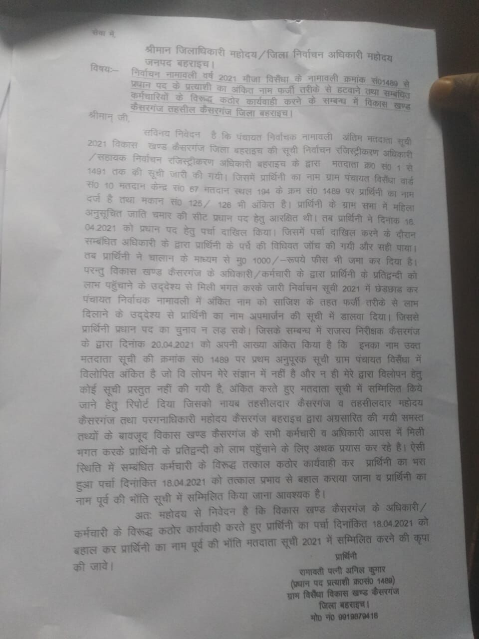 पीड़िता ने बताया कि ग्राम सभा बिसैंधा में महिला अनुसूचित जाति हरिजन महिला सीट प्रधान पद के लिए आरक्षित थी। इसी क्रम में उसने दिनांक 18 अप्रैल को प्रधान पद के लिए पर्चा दाखिल किया था। जिसमें पर्चा दाखिल करने के दौरान सम्बंधित अधिकारी के द्वारा पर्चे की विधिवत जांच की गयीं और सही पाया गया। प्रत्याशी सीतापति पत्नी सतगुरु व रामावती पत्नी अनिल कुमार ने चालान के माध्यम से एक हजार रुपए फीस भी जमा कर दिया था। परन्तु विकास खंड कैसरगंज के अधिकारी/कर्मचारी ने प्रतिवादी को लाभ पहुंचाने के उद्देश्य से मिलीभगत करके जारी निर्वाचन सूची2021 में छेड़छाड़ कर पंचायत निर्वाचन नामावली में अंकित नामों को साजिश के तहत फर्जी तरीक़े से प्रत्याशी सीतापति व रामावती का नाम विलोपित की सूची में डलवा दिया। जिससे प्रार्थिनी प्रधान पद का चुनाव न लड़ सके।