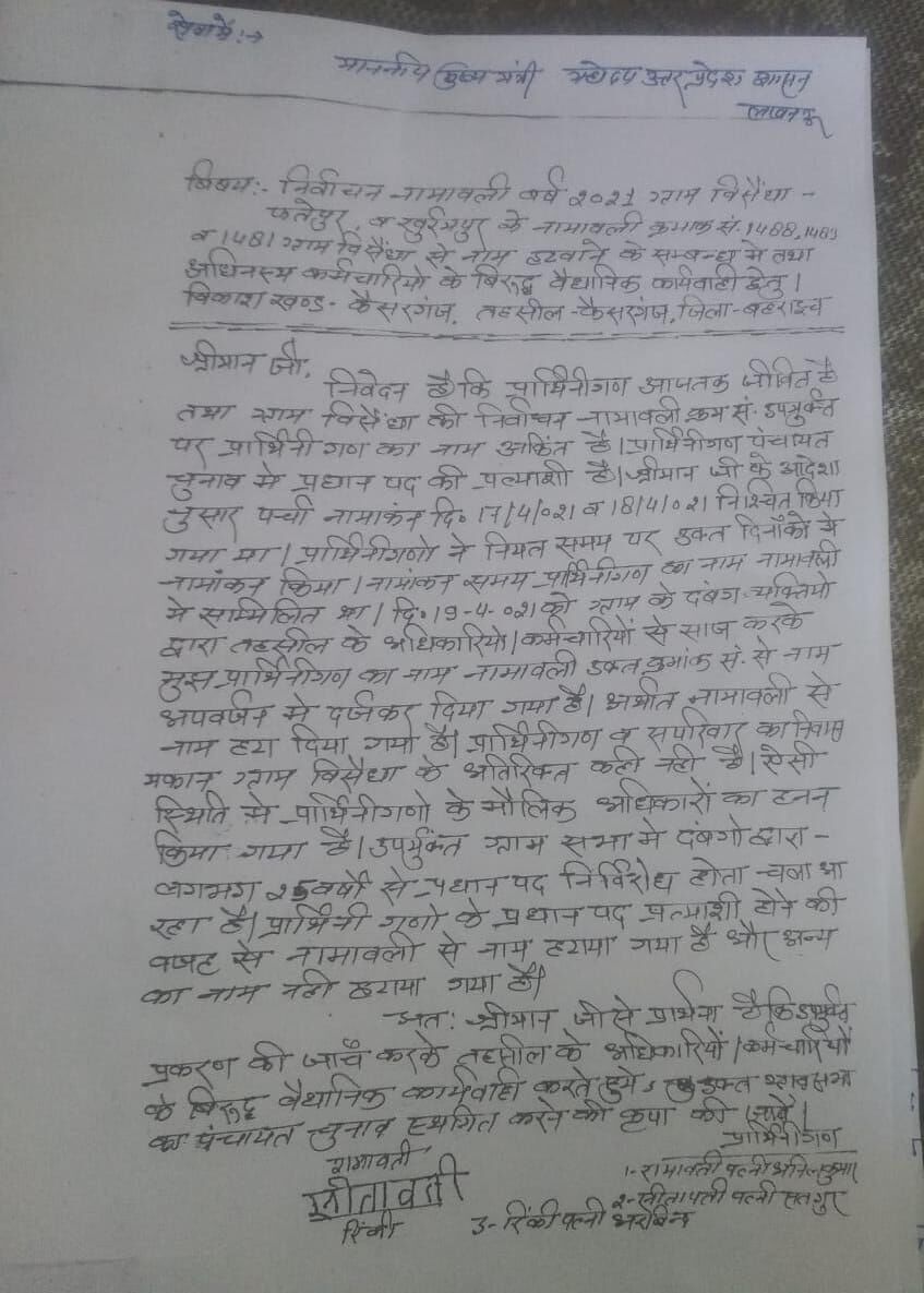 |पीड़ित सीतापति व रामावती ने मुख्यमंत्री उत्तर प्रदेश व जिलाधिकारी बहराइच को प्रार्थना पत्र भेजकर न्याय की गुहार लगाई है। एक पक्ष का आरोप है कि मतदाता सूची में नाम दर्ज होने के बाद भी उसका नामांकन रद्द करके दूसरे पक्ष को निर्विरोध निर्वाचित घोषित कर दिया गया है, जो कि अवैधानिक है।