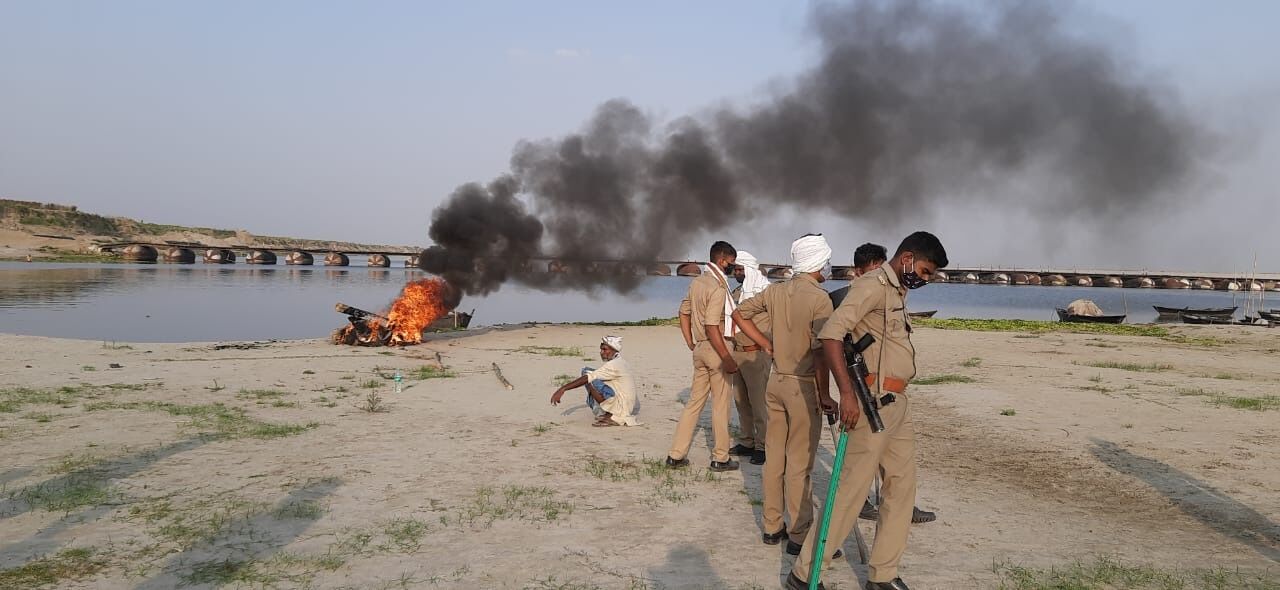 |गंगा में बहती लाश को बाहर निकाल कर पुलिस कर्मियों ने अंतिम संस्कार तो किया, लेकिन शव को जल्दी जलाने के चक्कर में उस पर टायर तो रखा ही, पेट्रोल भी छिड़कवा दिया। इसका वीडियो सोमवार की शाम सोशल मीडिया पर रन करने लगा। मामले का त्वरित संज्ञान लेते हुए एसपी डॉ. विपिन ताडा ने पांच सिपाहियों को सस्पेंड करने के साथ ही मामले की जांच एएसपी को दी है।