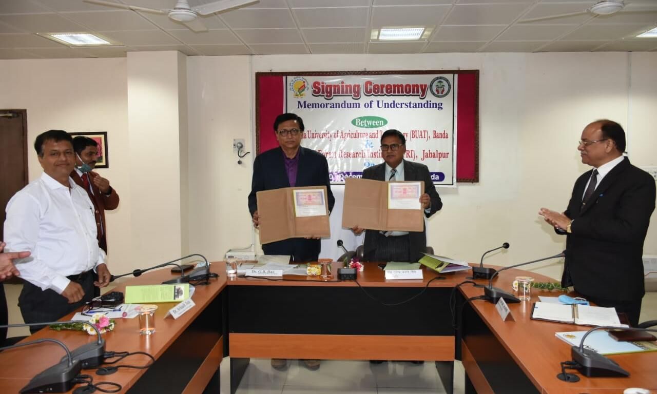 बांदा। कृषि एवं प्रौद्योगिक विश्वविद्यालय के अर्न्तगत संचालित वानिकी महाविद्यालय के तत्वाधान में कुलपति सभागार कक्ष में उष्ण कटिबंधीय वन अनुसंधान संस्थान, जबलपुर और बाँदा कृषि एवं प्रौद्योगिक वि0वि0, बाँदा के बीच में एक समझौता ज्ञापन पर हस्ताक्षर किये गये है। कृषि विश्वविद्यालय की तरफ से कुलपति प्रो0 नरेन्द्र प्रताप सिंह तथा उष्ण कटिबंधीय वन अनुसंधान संस्थान, जबलपुर के निदेशक डा0 जीआर राव ने समझौते पर हस्ताक्षर कर द्विपक्षीय दस्तावेज एक दूसरे को सौपें। यह समझौता बुन्देलखण्ड के जलवायु में वानिकी के महत्व को देखते हुए एक सराहनीय कदम है। कुलपति के कार्यभार ग्रहण करने के पश्चात् यह पहला समझौता किसी राष्ट्रीय संस्थान के साथ हुआ है।