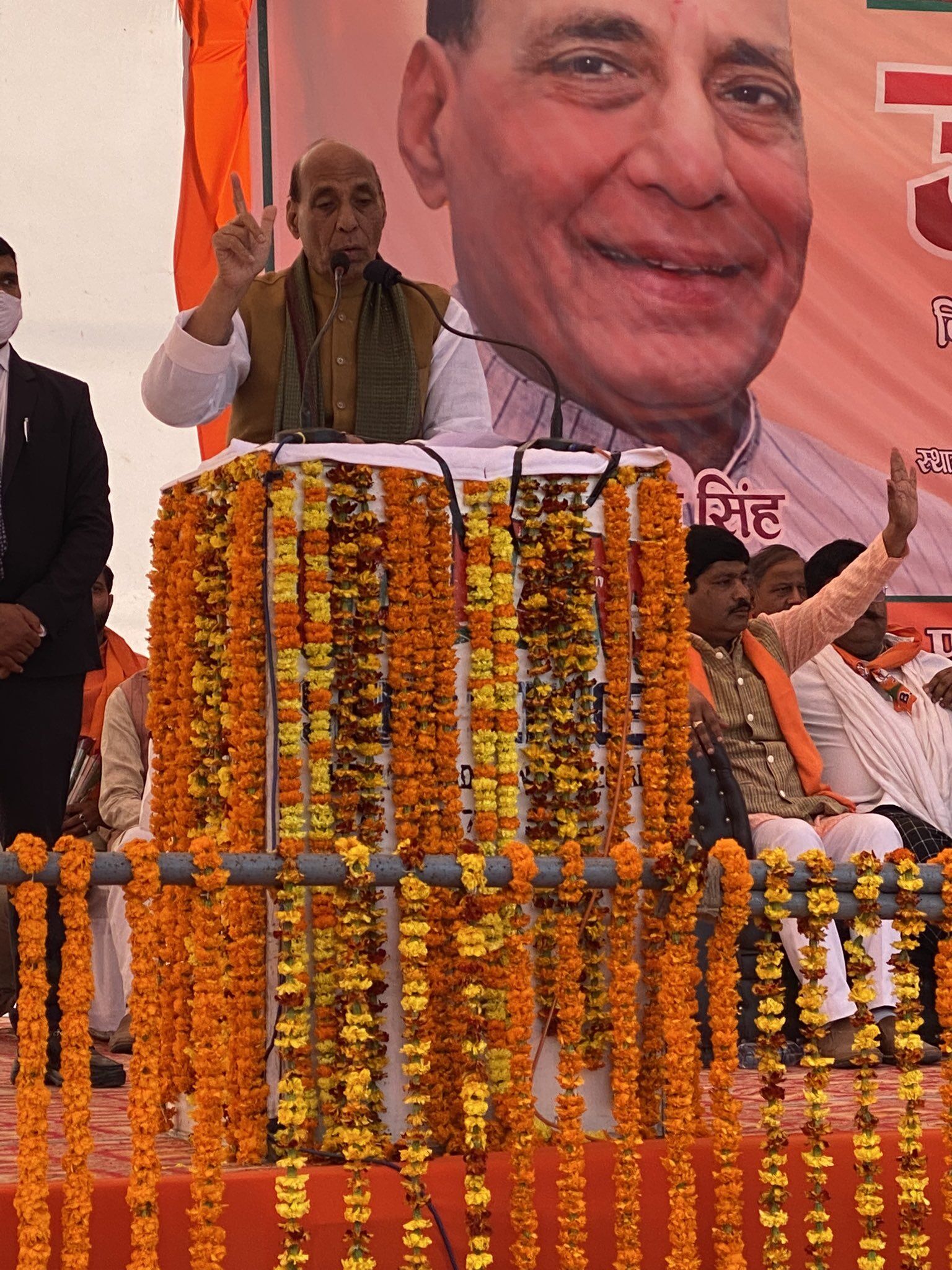 राजनाथ सिंह ने कहा कि जब तक देश के प्रधानमंत्री मोदी हैं, भारत माता का मस्तक झुकने नहीं देंगे। पुलवामा में आतंकी हमला हुआ तो मैं रक्षा मंत्री था। हमारी सेना ने सर्जिकल स्ट्राइक कर आतंक के ठिकानों को नष्ट किया। ये नया भारत है। हमने दुनिया को संदेश दिया है कि भारत को किसी ने भी आंख दिखाई तो हम बाउंड्री के उस पार भी मार सकते हैं। लोगों से अपील किया कि देश से बड़ा कोई व्यक्ति नहीं हो सकता। भाजपा देश का मस्तक ऊंचा कर रही है। इसलिए किसी लालच में मत आना। उन्होंने कहा कि कोरोना काल में विश्व ने भारत की ताकत को देखा है। दुनिया के बड़े देश भी अपनी पूरी आबादी को टीका नहीं लगा सके। लेकिन भारत में सभी को टीका लग चुका है। हमारी वैक्सीन दूसरे देश में भी लग रहे। लोगों से पूछा कि सपा, बसपा या कांग्रेस क्या ऐसा कर सकती थी ?