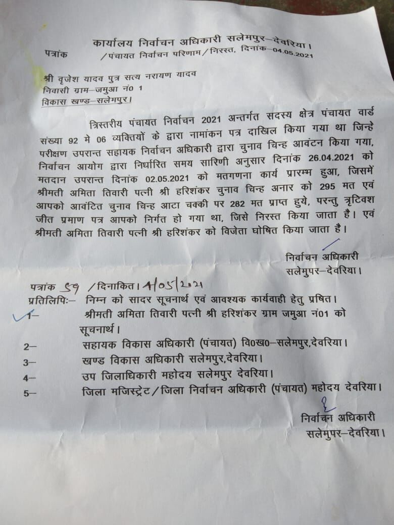 देवरिया: मतगणना पूरी होने से पहले ही दे दिया जीत का प्रमाणपत्र