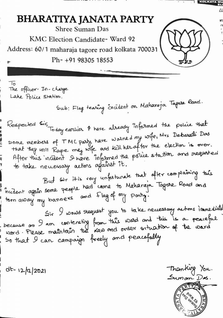 |कोलकाता। कोलकाता नगर निगम (केएमसी) चुनाव में भी माहौल हिंसक बनता जा रहा है। वार्ड नंबर 92 से भारतीय जनता पार्टी के उम्मीदवार सुमन दास की पत्नी देवव्रती को दुष्कर्म और हत्या की धमकी दी गई है। इस संबंध में लेक थाने में प्राथमिकी भी दर्ज कराई गई है।