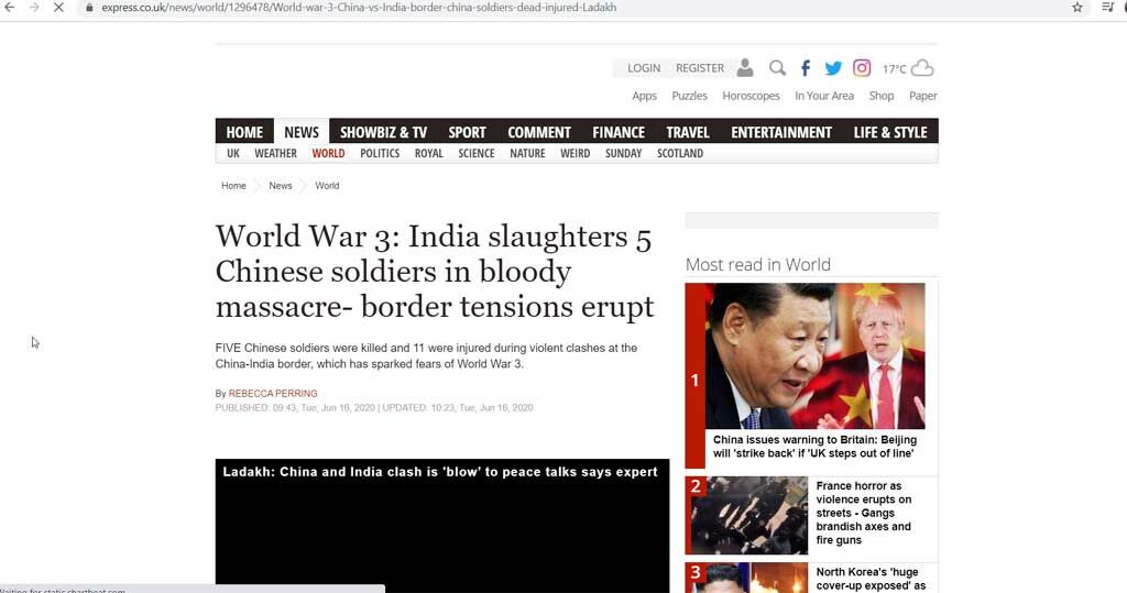 लद्दाख की गलवान घाटी में हुए टकराव में भारतीय सेना के एक अधिकारी और दो सैनिक शहीद हुए। जबकि खूनी नरसंहार के जवाब में पांच चीनी सैनिक मारे गए हैं। परमाणु शक्ति संपन्न पड़ोसियों के बीच टकराव के परिणामस्वरूप दशकों में यह पहली बार दुर्घटना की सूचना है।