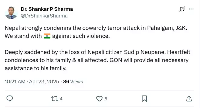 भारत में नेपाल के राजदूत डॉ. शंकर पी. शर्मा ने कहा, "नेपाल जम्मू-कश्मीर के पहलगाम में हुए कायरतापूर्ण आतंकवादी हमले की कड़ी निंदा करता है। हम ऐसी हिंसा के खिलाफ भारत के साथ खड़े हैं। नेपाली नागरिक सुदीप न्यौपाने की मौत से गहरा दुख हुआ है। उनके परिवार और सभी प्रभावितों के प्रति हार्दिक संवेदना। नेपाल सरकार उनके परिवार को सभी आवश्यक सहायता प्रदान करेगी।"