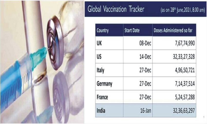 सोमवार, 28 जून की सुबह 8 बजे तक ब्रिटेन में 7 करोड़, 67 लाख 74 हजार 990, अमेरिका में 32 करोड़, 33 लाख, 27 हजार 328, इटली में 4 करोड़ 96 लाख 50 हजार 721, जर्मनी में 7 करोड़ 14 लाख 37 हजार 514 और फ्रांस में अब तक 5 करोड़ 24 लाख 57 हजार 288 टीके लगाए जा चुके हैं।