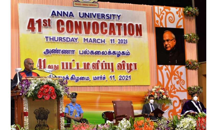 राष्ट्रपति कोविंद आज चेन्नई स्थित अन्ना विश्वविद्यालय के 41वें दीक्षांत समारोह को संबोधित कर रहे थे। उन्होंने कहा कि अन्ना विश्वविद्यालय में आना उनके लिए सम्मान की बात है क्योंकि पूर्व राष्ट्रपति भारत रत्न डॉ ए.पी.जे. अब्दुल कलाम भी इस विश्वविद्यालय के पूर्व छात्र थे।