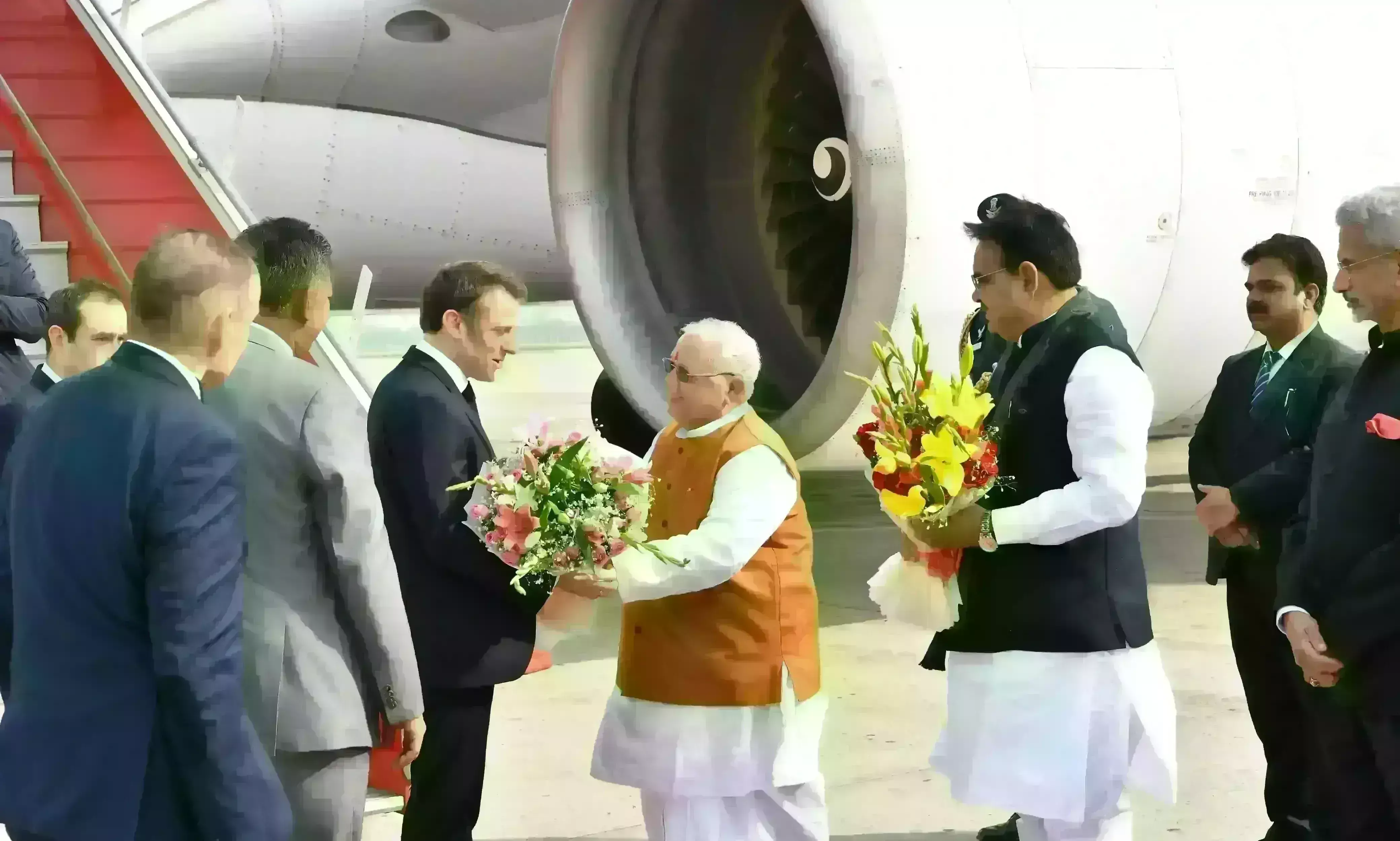 फ्रांस के राष्ट्रपति इमैनुएल मैक्रों जयपुर पहुंचे, राजस्थानी परंपरा से हुआ स्वागत