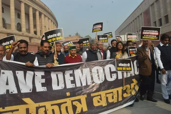 खड़गे ने कहा कि प्रधानमंत्री और गृह मंत्री बाकी जगहों पर बात कर रहे हैं लेकिन वे सदन में बयान नहीं देते हैं, ये सदन का अपमान है। उपराष्ट्रपति के अपमान मुद्दे पर पूछे गए एक सवाल के जवाब में खड़गे ने कहा कि उन्हें (उपराष्ट्रपति को) इस मुद्दे को जातीय मुद्दा नहीं बनाना चाहिए। लोकतंत्र में सभी को अपनी बात रखने का अधिकार है। उल्लेखनीय है कि आईएनडीआईए घटक दलों के सांसदों ने गुरुवार को कांग्रेस अध्यक्ष मल्लिकार्जुन खड़गे के नेतृत्व में सांसदों के निलंबन और संसद में हुई सुरक्षा चूक के मुद्दे पर संसद से विजय चौक तक विरोध मार्च निकाला। इस दौरान विपक्ष ने मांग की कि गृह मंत्री संसद में हुई सुरक्षा चूक के मुद्दे पर दोनों सदन में जवाब दें और सभी निलंबित सांसदों का निलंबन वापस लिया जाए।