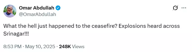 जम्मू-कश्मीर के सीएम उमर अब्दुल्ला ने ट्वीट किया, "संघर्ष विराम को क्या हो गया? श्रीनगर में विस्फोटों की आवाजें सुनी गईं"