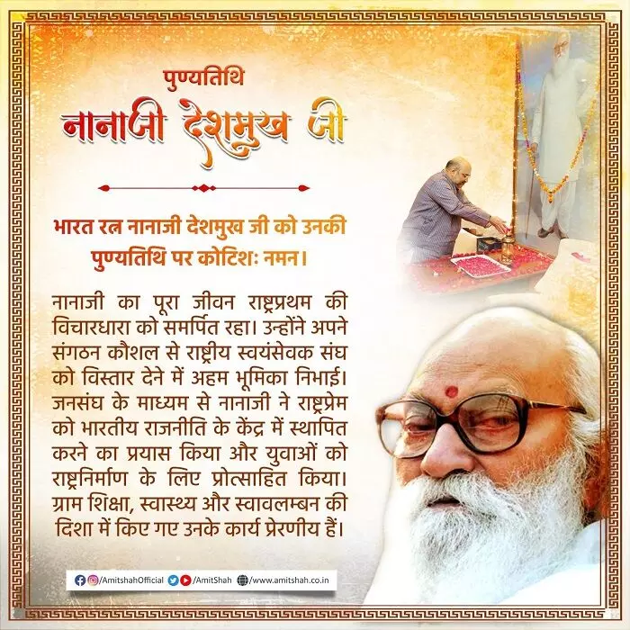 केंद्रीय गृहमंत्री शाह ने लिखा, '' नानाजी का पूरा जीवन राष्ट्रप्रथम की विचारधारा को समर्पित रहा। उन्होंने अपने संगठन कौशल से राष्ट्रीय स्वयंसेवक संघ को विस्तार देने में अहम भूमिका निभाई। जनसंघ के माध्यम से नानाजी ने राष्ट्रप्रेम को भारतीय राजनीति के केंद्र में स्थापित करने का प्रयास किया और युवाओं को राष्ट्र निर्माण के लिए प्रोत्साहित किया। ग्राम शिक्षा, स्वास्थ्य और स्वावलम्बन की दिशा में किए गए उनके कार्य प्रेरणीय हैं।''