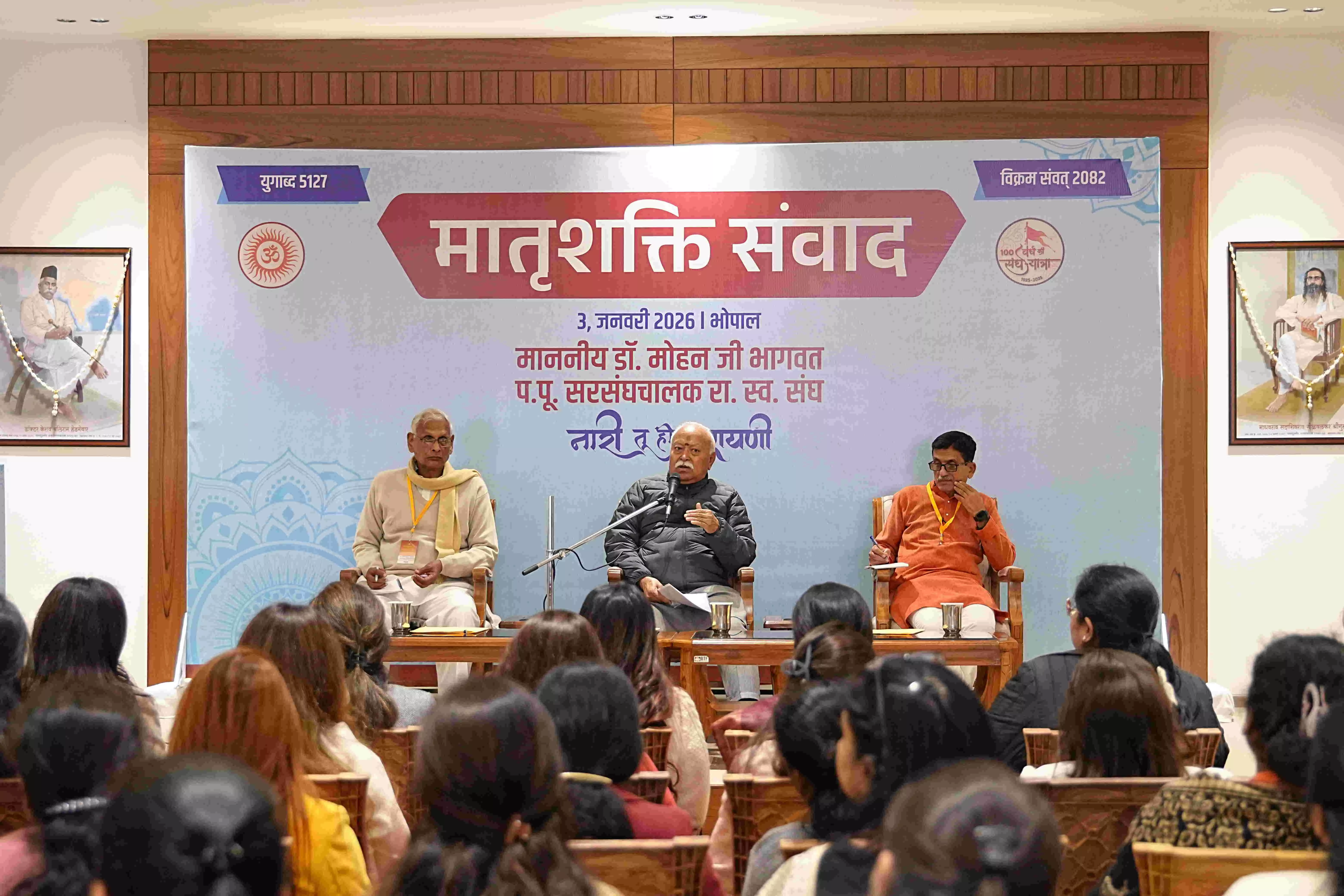 भोपाल | राष्ट्रीय स्वयंसेवक संघ की ओर से भोपाल में स्थित शिवनेरी भवन में आयोजित 'स्त्री शक्ति संवाद' कार्यक्रम को सरसंघचालक डॉ. मोहन भागवत ने संबोधित किया। कार्यक्रम में मंच पर प्रांत संघचालक श्री अशोक पांडेय एवं विभाग संघचालक श्री सोमकांत उमालकर उपस्थित रहे। संवाद का वातावरण गंभीर, विचारोत्तेजक और आत्ममंथन से परिपूर्ण रहा। कार्यक्रम की मूल भावना “नारी तू ही नारायणी” के भाव को केंद्र में रखकर आगे बढ़ी।