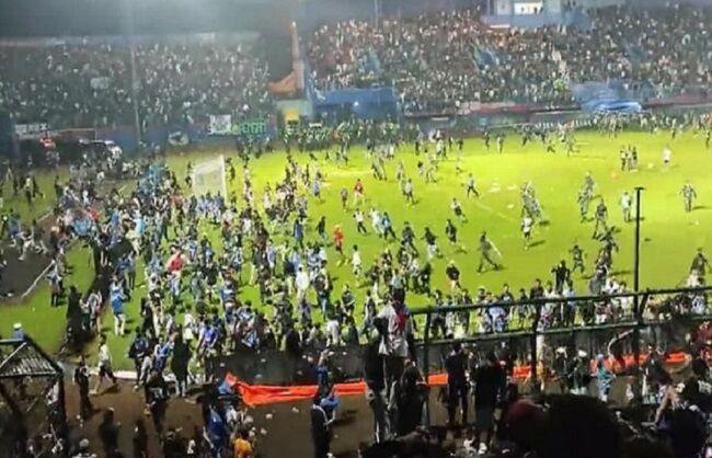 जकार्ता। इंडोनेशिया के पूर्वी जावा प्रांत में शनिवार रात अरेमा एफसी और पर्सेबाया सुरबाया टीम के बीच फुटबॉल मैच समाप्त होने पर भड़ी हिंसा के बाद मची भगदड़ में मरने वालों की संख्या 174 पहुंच गई है। पहले बताया गया था कि 129 लोगों की मौत हुई है। पूर्वी जावा के डिप्टी गवर्नर एमिल दर्डक ने रविवार को स्थानीय मीडिया से कहा है कि इस भगदड़ में 174 लोगों की जान गई है और 180 से ज्यादा लोग घायल हैं।