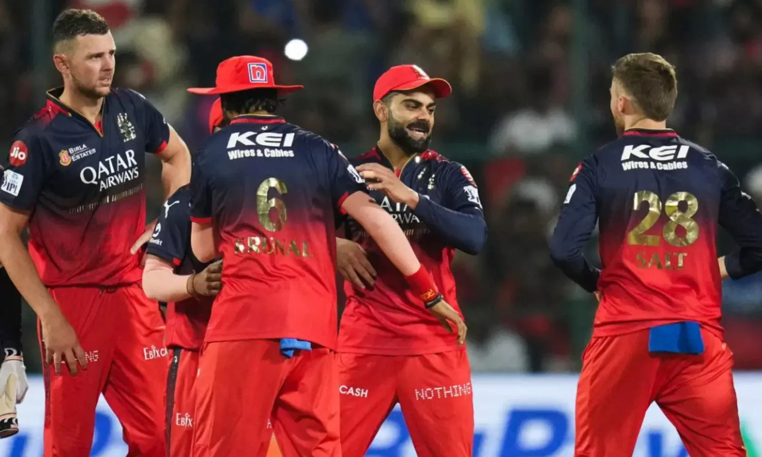 RCB: जैकब बैथेल, विराट कोहली, देवदत्त पडिक्कल, टिम डेविड, जितेश शर्मा, क्रुणाल पंड्या, भुवनेश्वर कुमार, रोमारियो शेफर्ड, यश दयाल, लुंगी एनगिडी, रजत पाटीदार (कप्तान)।