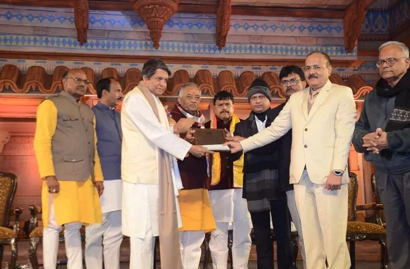 ग्वालियर (Gwalior)। संगीतधानी ग्वालियर (Sangeetdhani Gwalior) में आयोजित विश्व संगीत समागम "तानसेन समारोह 2023" (World Music Festival "Tansen Festival 2023") के दूसरे दिन सोमवार देर शाम हुए भव्य एवं गरिमामय समारोह में हिन्दुस्तानी शास्त्रीय संगीत के मूर्धन्य गायक पं. गणपति भट्ट हासणगि (Pandit Ganapati Bhatt Hassanagi, a prominent singer of Hindustani classical music.) धारवाड़ को वर्ष 2022 के "राष्ट्रीय तानसेन सम्मान'' से अलंकृत (Decorated with "National Tansen Award") किया गया। साथ ही उज्जैन की संस्था मालव लोक कला केन्द्र को वर्ष 2022 के “राजा मानसिंह तोमर सम्मान” प्रदान किया गया।