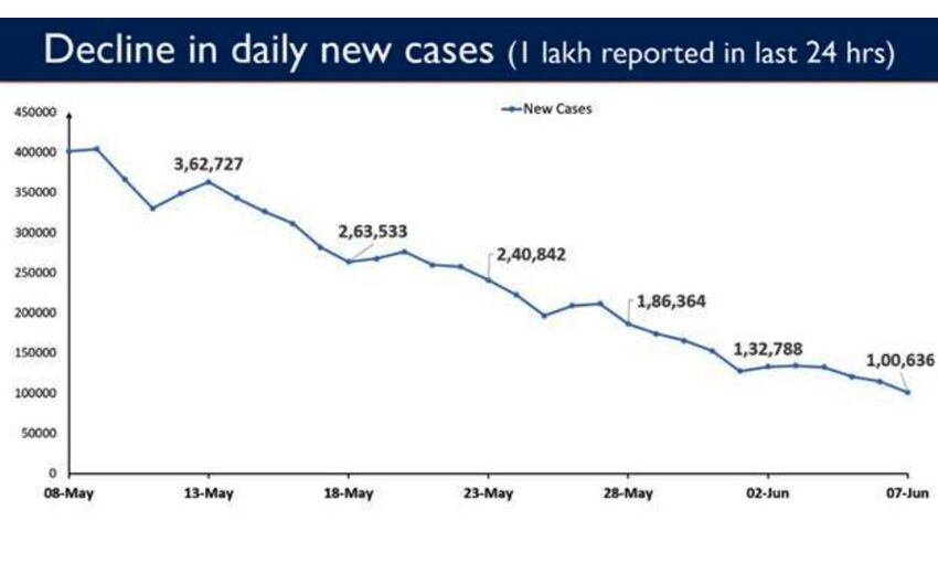 नईदिल्ली। भारत में पिछले 24 घंटों में एक लाख नए मामले दर्ज हुए हैं जो पिछले 61 दिनों में सबसे कम हैं। इसके साथ ही देशभर में सक्रिय मरीजों की संख्या कम होकर 14,01,609 हो गयी है।