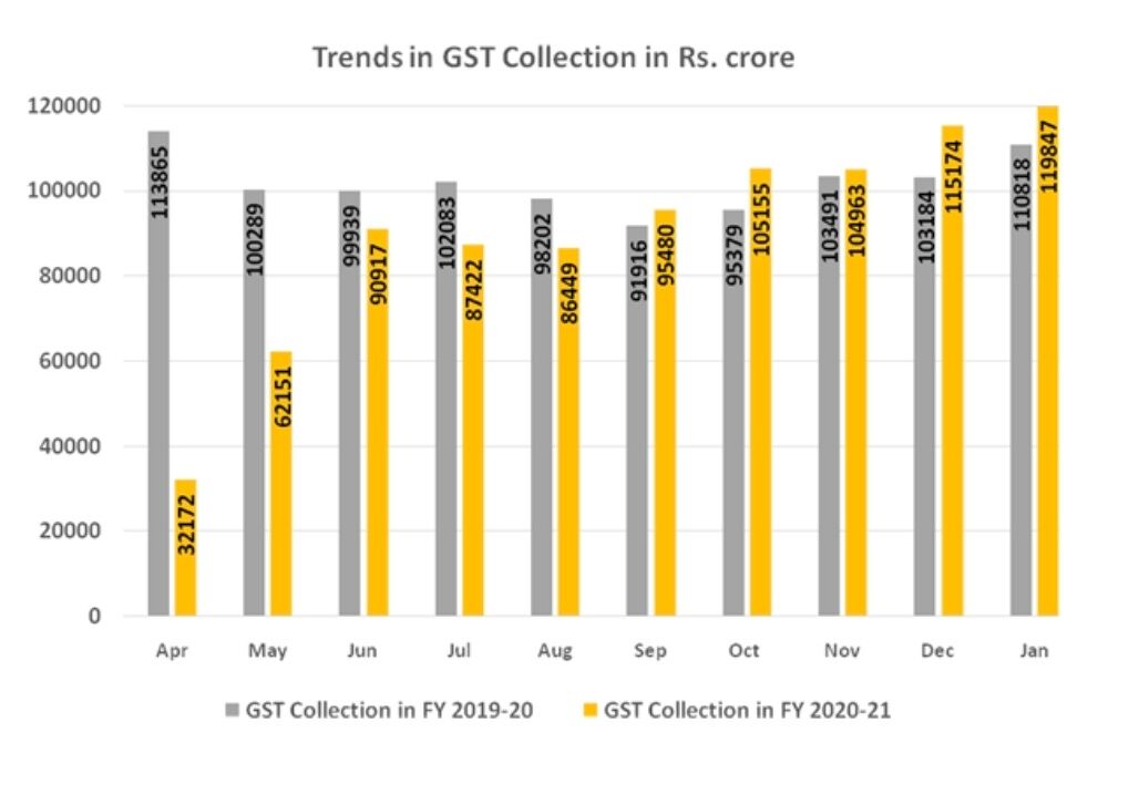 Reading Time: नईदिल्ली। वित्त वर्ष 2021-22 का बजट पेश किए जाने से ठीक पहले देश की अर्थव्यवस्था के लिए अच्छी खबर आई है। जनवरी में 1.20 लाख करोड़ रुपए का जीएसटी कलेशन हुआ है, जोकि गुड्स एंड सर्विसेज टैस (जीएसटी) को लागू किए जाने के बाद से सर्वाधिक है। पिछले महीने 1.15 लाख करोड़ रुपए का जीएसटी कलेशन हुआ था, जबकि पिछले साल के इसी महीने के मुकाबले 10 हजार करोड़ रुपए अधिक राजस्व मिला है। वित्त मंत्रालय की ओर से जारी आंकड़ों के मुताबिक, 31 जनवरी शाम 6 बजे तक 1,19,847 करोड़ रुपए का जीएसटी प्राप्त हुआ है। इसमें से CGST 21,923 करोड़ रुपए है, जबकि SGST 29,014 करोड़ रुपए, IGST 60,288 करोड़ रुपए है। दिसंबर से 21 जनवरी तक 90 लाख जीएसटी आरबी रिटर्न दाखिल की गई है.