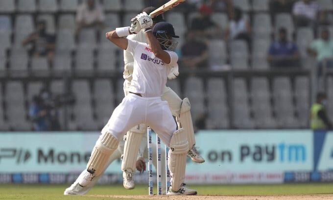 इससे पहले आज दिन की शुरुआत भारत के लिए खराब रही। न्यूजीलैंड के स्पिनर एजाज पटेल ने दिन के अपने पहले ही ओवर में भारत को लगातार दो झटके दिए। उन्होंने पहले रिद्धिमान साहा (27) को एलबीडब्ल्यू आउट किया और फिर अगली ही गेंद पर रविचन्द्रन अश्विन को बोल्ड कर दिया। अश्विन खाता भी नहीं खोल सके। इसके बाद भारत ने शुरुआती झटके से उबरते हुए मजबूत वापसी की है। मयंक अग्रवाल और अक्षर पटेल ने मिलकर 50 रनों से अधिक की साझेदारी की। इस बीच मयंक अग्रवाल ने अपने 150 रन भी पूरे किए। हालांकि इसके बाद वह एजाज पटेल की गेंद पर वह आउट हो गए। यहां से अक्षर पटेल ने कुछ बड़े शॉट खेले और टेस्ट में अपना पहला अर्धशतक पूरा किया। अंत में भारत 10 विकेट पर 325 रन बना सका। न्यूजीलैंड की तरफ से एजाज पटेल ने पूरे 10 विकेट अपने नाम किए।