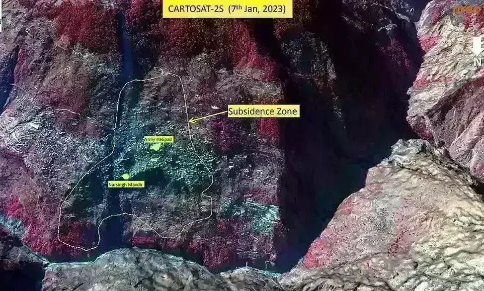 सैटेलाइट तस्वीरों में दिख रही लाल रंग की धारियां सड़कें हैं। नीले रंग का घेरा जोशीमठ के नीचे का ड्रेनेज सिस्टम है। जोशीमठ के मध्य भाग को लाल रंग के गोले में दशार्या गया है। यह सबसे ज्यादा भू-धंसाव प्रभावित है। इस धंसाव का ऊपर हिस्सा जोशीमठ औली रोड पर मौजूद है।उल्लेखनीय है कि जोशीमठ में इस समय हाहाकार मचा हुआ है। केंद्र और उत्तराखंड सरकार लोगों को पहले सुरक्षित स्थानों पर शिफ्ट कर रही है। यहां का बड़ा इलाका असुरक्षित घोषित किया गया है।