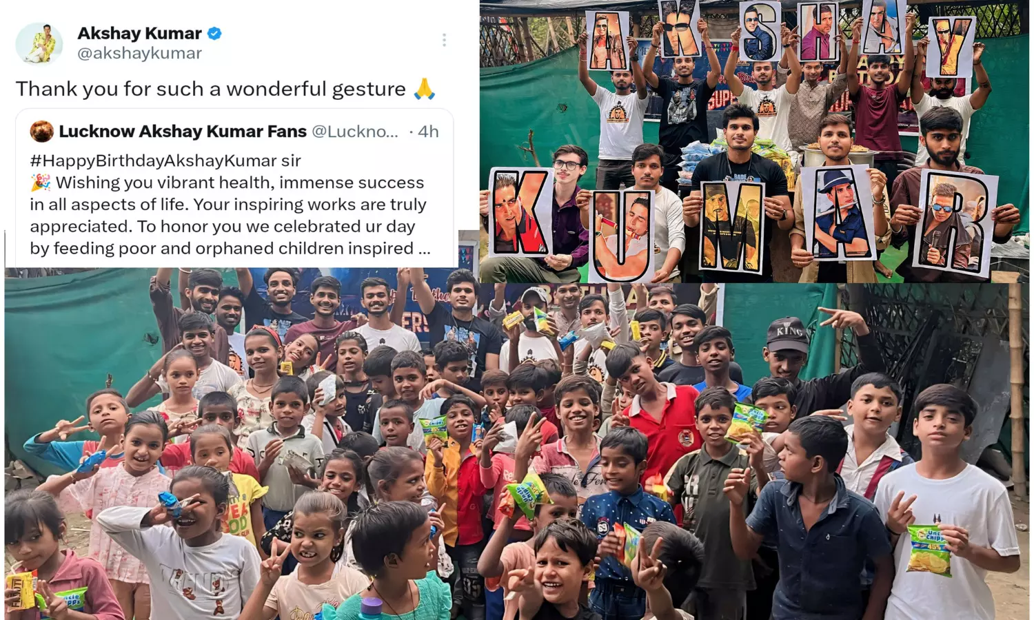 विशालाक्षी फाउंडेशन के तहत चलने वाले इस 'ड्रीम स्कूल' में गरीब और अनाथ बच्चों की शिक्षा और देखभाल की जाती है। 'लखनऊ अक्कियन्स' ने इन बच्चों के साथ अक्षय कुमार के जन्मदिन की खुशी साझा की और उन्हें भोजन कराया। अक्षय कुमार के सामाजिक कार्यों की सराहना करते हुए, 'लखनऊ अक्कियन्स' के सदस्यों ने कहा कि हम अपने आदर्श अभिनेता के जन्मदिन पर उनकी सामाजिक जिम्मेदारियों को निभाने की कोशिश कर रहे। अक्षय कुमार ने इस अद्भुत पहल के लिए लखनऊ अक्कियंस का आभार व्यक्त किया। उन्होंने ट्विटर पर प्रतिक्रिया देते हुए लिखा कि इस शानदार कार्य के लिए आप सबका धन्यवाद। इस संदेश के साथ उन्होंने अपने प्रशंसकों की सराहना की और उनके प्रयासों की सराहना की।