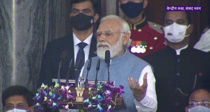 उन्होंने संबोधन की शुरुआत करते हुए कहा आज का दिवस बाबासाहेब अम्बेडकर, डॉ राजेन्द्र प्रसाद जैसे दुरंदेशी महानुभावों का नमन करने का है।आज का दिवस इस सदन को प्रणाम करने का है। आज 26/11 हमारे लिए एक ऐसा दुखद दिवस है, जब देश के दुश्मनों ने देश के भीतर आकर मुंबई में आतंकवादी घटना को अंजाम दिया। भारत के अनेक वीर जवानों ने आतंकवादियों से लोहा लेते-लेते अपने आप को समर्पित कर दिया। मैं आज 26/11 को उन सभी बलिदानियों को भी आदरपूर्वक नमन करता हूं।