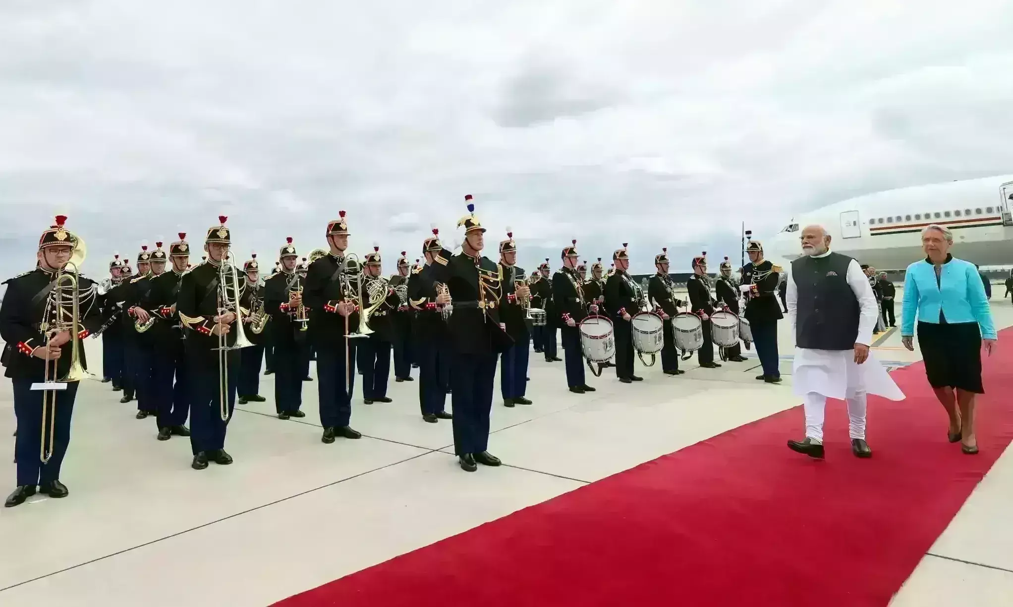 भारत के प्रधानमंत्री गुरुवार को तीन दिन के विदेश दौरे पर निकले हैं। वे दो दिन फ्रांस और एक दिन संयुक्त अरब अमीरात में रहेंगे। गुरुवार को फ्रांस पहुंचे भारतीय प्रधानमंत्री नरेन्द्र मोदी के स्वागत के लिए पेरिस के हवाई अड्डे पर फ्रांस की प्रधानमंत्री एलिजाबेथ बोर्न स्वयं पहुंची थीं। प्रधानमंत्री का हवाई जहाज पहुंचते ही फ्रांसीसी प्रधानमंत्री ने उनकी अगवानी की। इसके बाद उन्हें समारोहपूर्वक गार्ड ऑफ ऑनर दिया गया। हवाई अड्डे पर भारतीय प्रधानमंत्री के स्वागत में भारतीय राष्ट्रगान की धुन बजाई गयी। फ्रांस स्थित भारतीय दूतावास के अधिकारी भी हवाई अड्डे पर अपने प्रधानमंत्री के स्वागत के लिए पहुंचे थे।